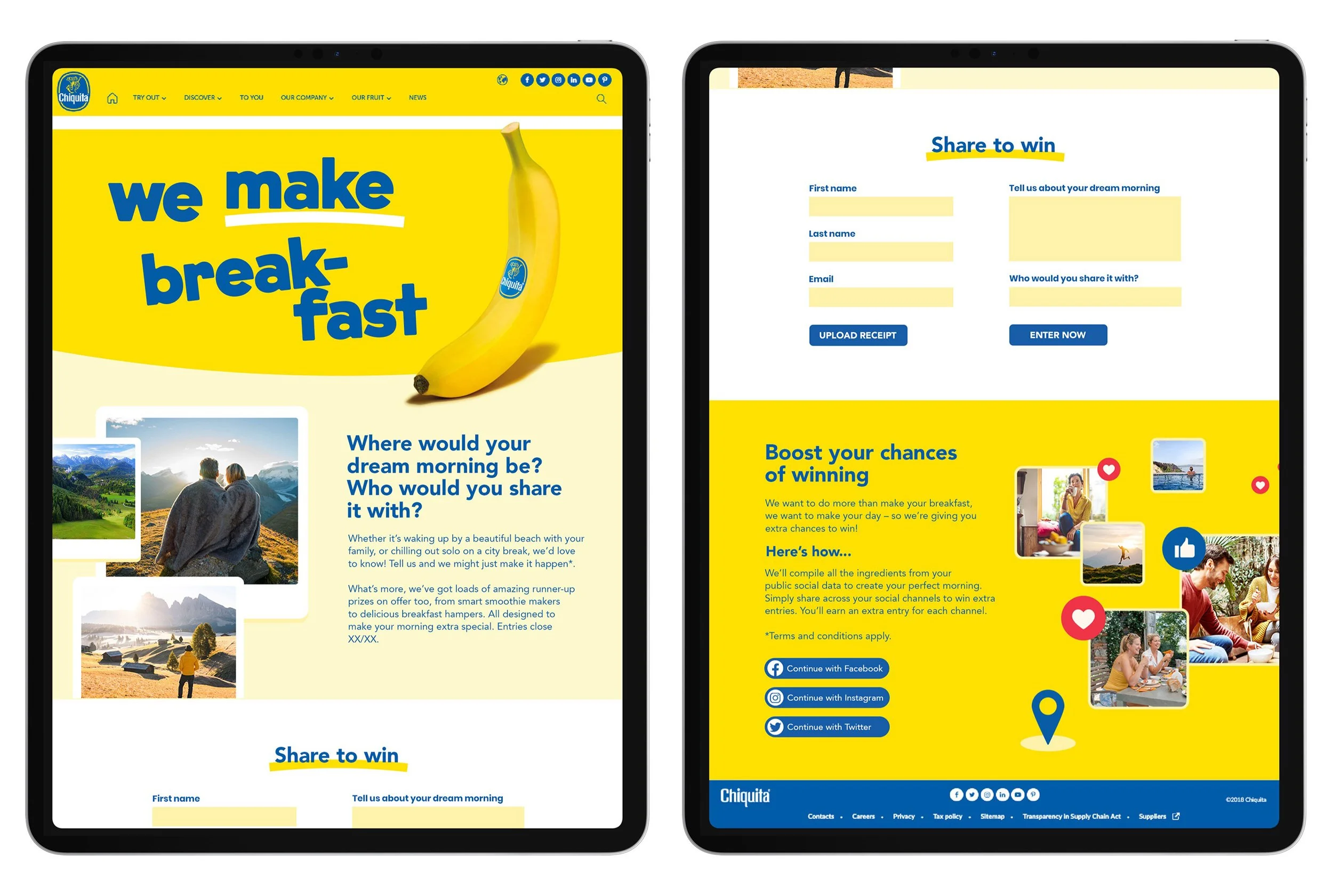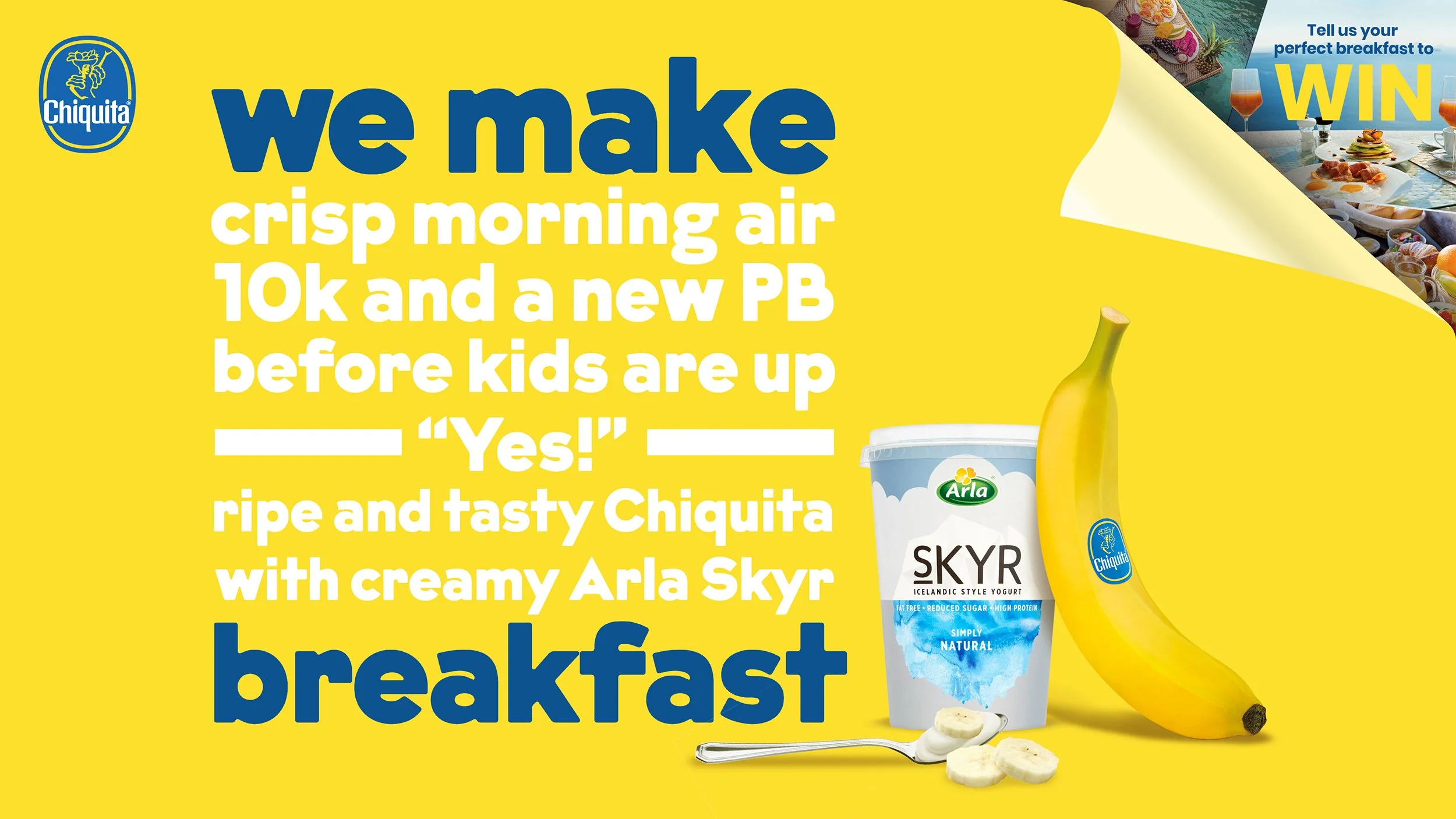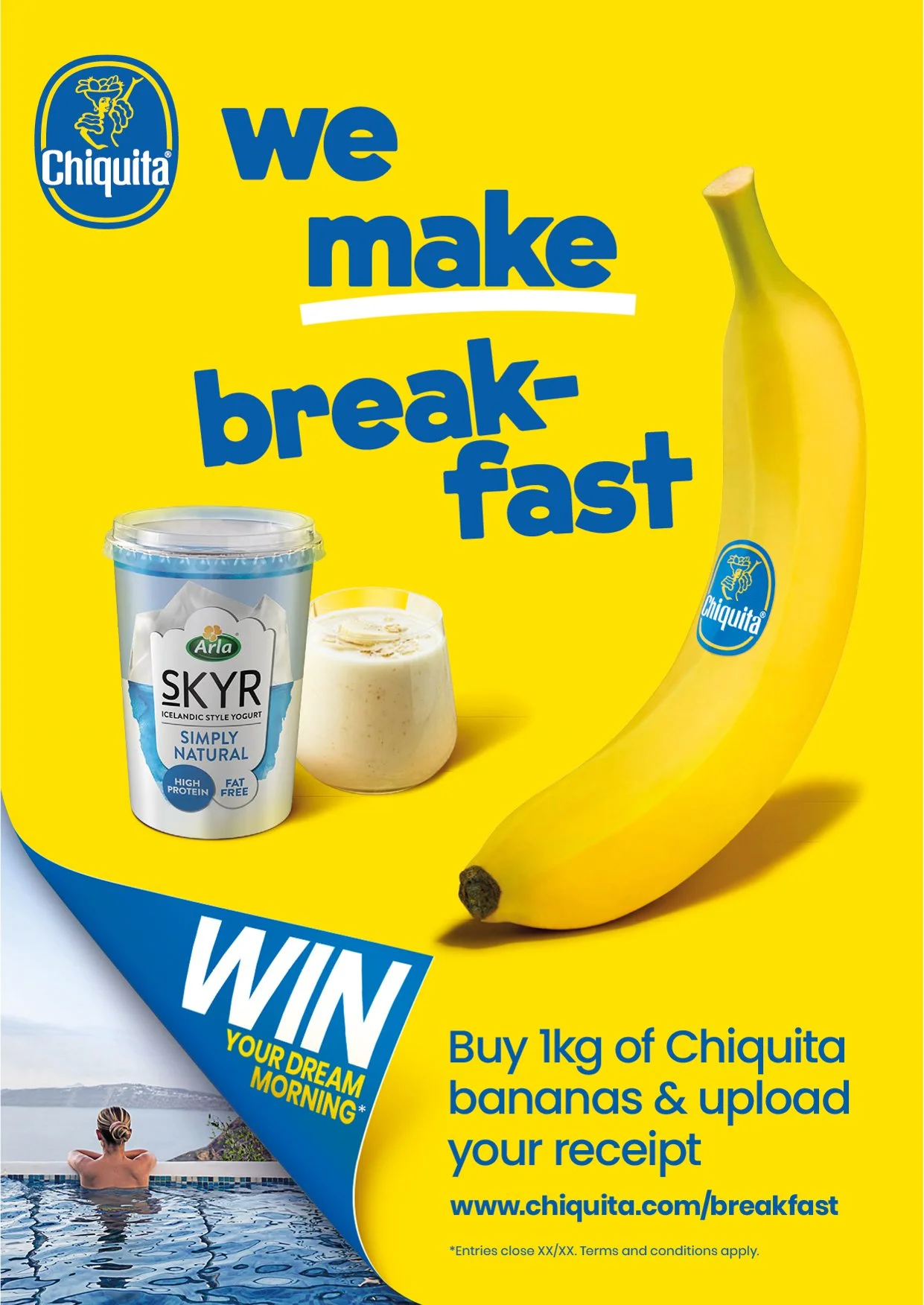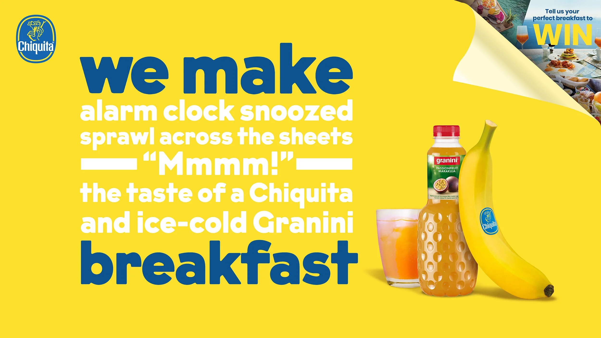 Chiquita bananas are certified best in quality and taste - this is proven. They’re also a nutritional powerhouse. This mighty combination makes them the perfect breakfast food. Our aim with this campaign is to effectively own breakfast. To do this we will invite consumers to win their dream morning experience. We’ll also offer runner-up prizes, all designed to make breakfast/mornings the best part of the day.