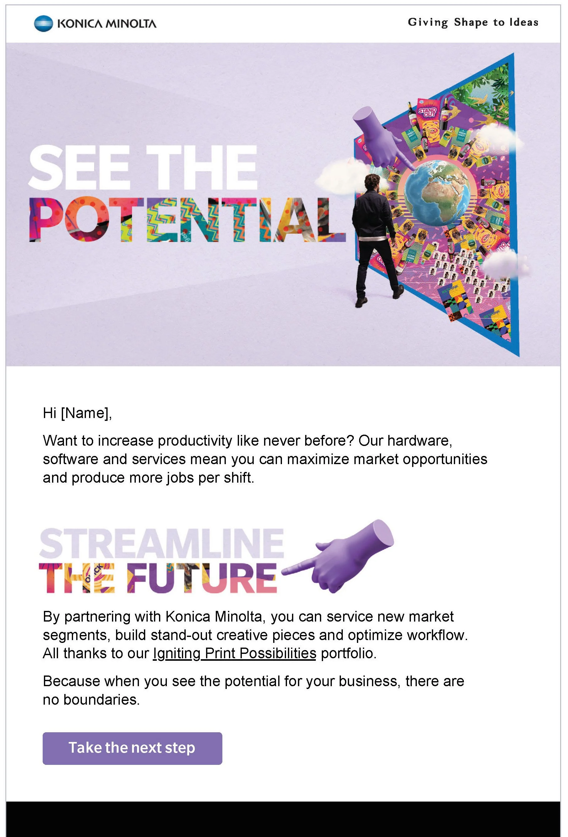 Kicking against the industry’s obsession with speeds, feeds, and lead times, See the Potential is the creative embodiment of Konica Minolta’s Igniting Print Possibilities (IPP) proposition. Leaving behind the usual mundane narrative of cost and productivity seen in competitor communications, it celebrates print’s potential and how Konica Minolta is committed and ready to help its audience tap into it. Whether entering new markets, embracing new techniques, or creating ever more unique customer experiences.